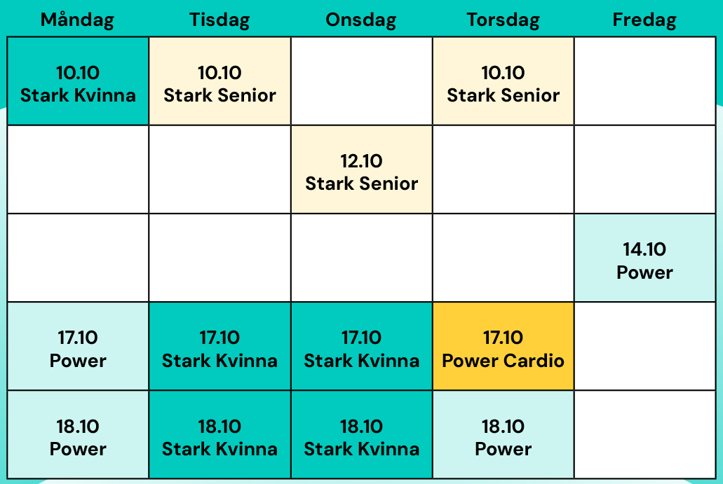 Aktuella pass samt dag och tid för träning i liten grupp om max 8 deltagare med en personlig tränare som ledare, hittar du lite längre ned.