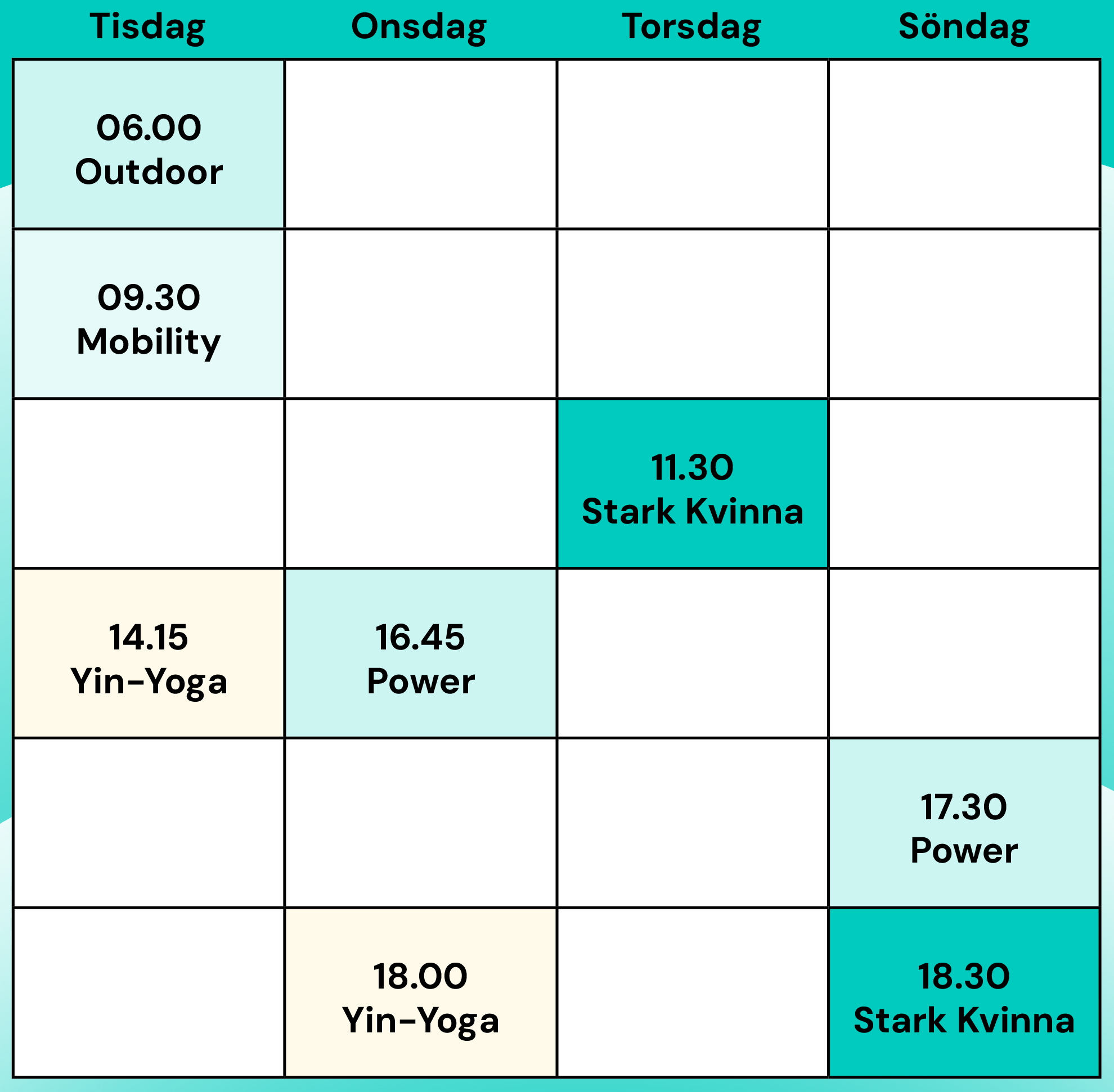 Aktuella pass samt dag och tid för träning i liten grupp om max 8 deltagare med en personlig tränare som ledare, hittar du lite längre ned.